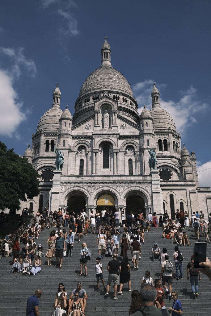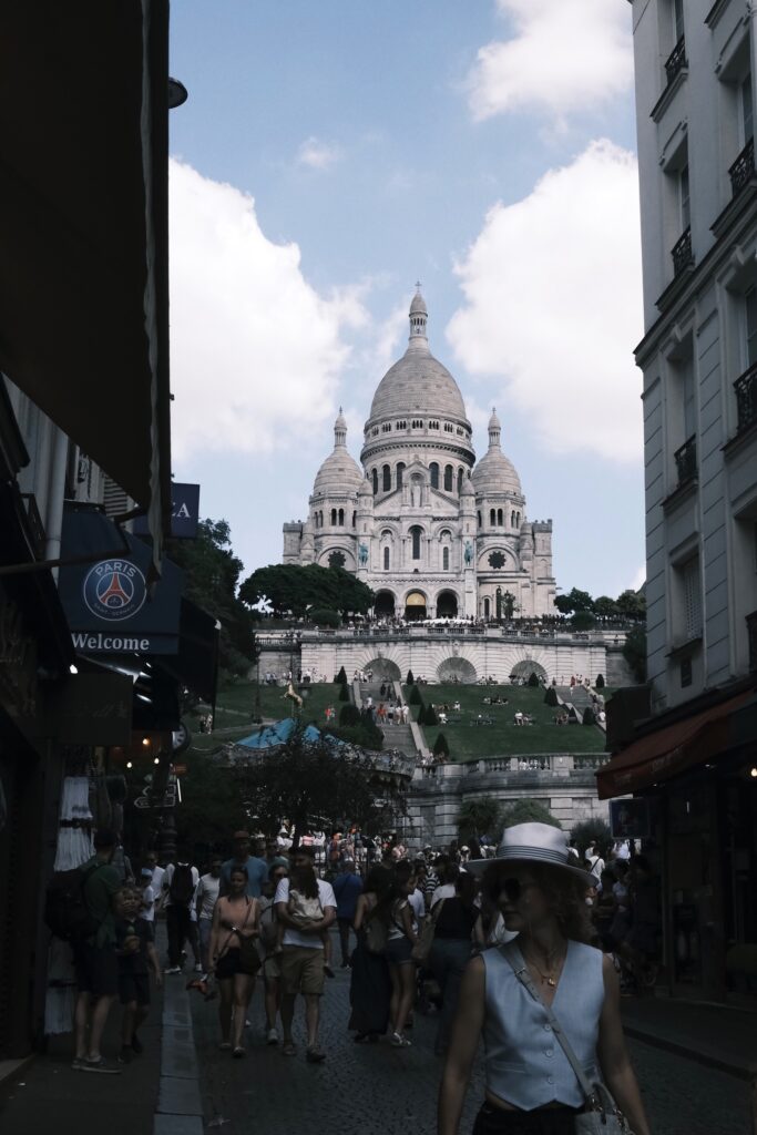 Zu Beginn meines Rundgangs öffnet sich zwischen den Häuserzeilen ein imposanter Blick auf die Basilika Sacré-Cœur. Die Kamera fängt in dieser Szene den Treffpunkt von quirligen Straßenszenen und der Erhabenheit des Baus ein. Das helle Gestein der Basilika leuchtet kontrastreich vor dem Pastellblau des Himmels. Menschen aus aller Welt bewegen sich zwischen Souvenirläden und Straßenmusikern.