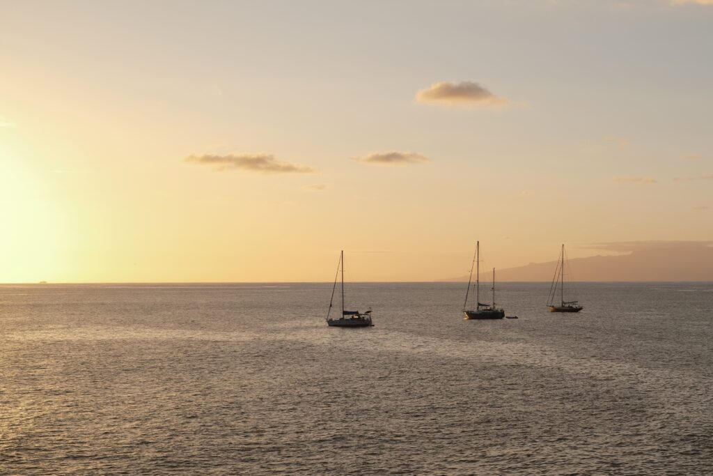Sonnenuntergang am Playa de Las Vistas im Süden Teneriffas mit drei Booten, die auf dem Meer ankern.